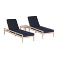 Indulge in outdoor relaxation with our two chaise loungers and a matching side table. Crafted from durable acacia wood with a natural oil stain, these loungers exude warmth and resilience. Paired with navy cushions in 100% olefin fabric, they offer comfort and chic elegance. With a weight capacity of 275lbs and a seat height of 15", these loungers ensure a confident and relaxing experience. The accompanying side table, standing at 20.25" in height with a weight capacity of 100lbs, provides a convenient surface for drinks or essentials, completing your outdoor oasis with both style and functionality.