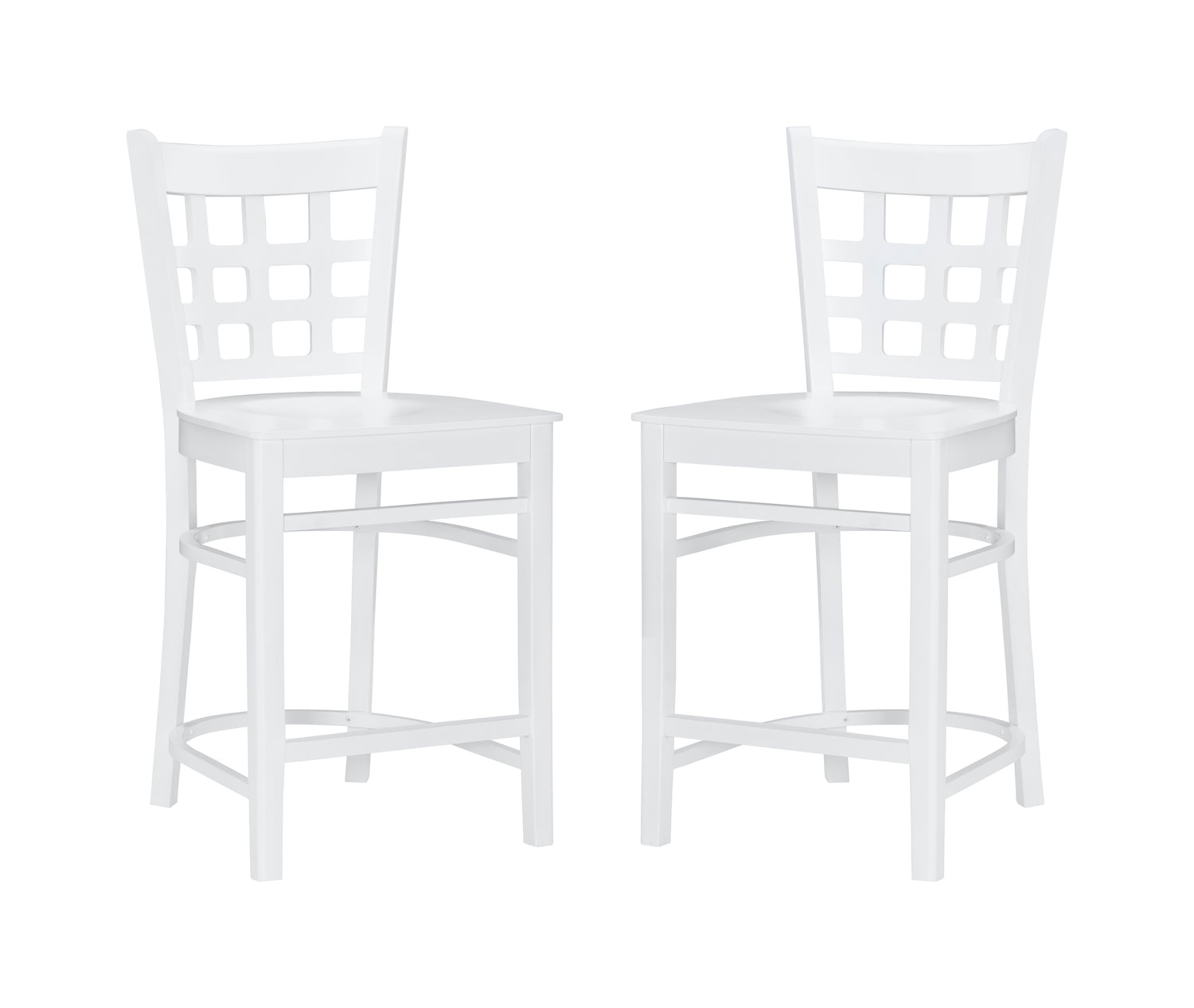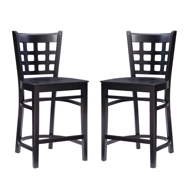 Holding to tradition yet striking balance with modern temperament, this farmhouse style counter stool is a perfect addition to a variety of dining settings. A grid of open squares is framed by the curved back, inspired by lattice fencing of distant countryside's. Made of solid beechwood for ensured strength and stability, the frame is painted or unfinished and features an optional brass kickback plate that can be attached to the footrest upon arrival. With a seat height of 24", the set of 2 is an ideal match for counters 35" to 39" high and supports up to 300 lbs each stool. Commercial grade