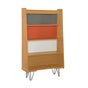 Add contemporary style and storage to your home with the perry bookcase. Four shelves provide ample storage and display space. White, orange and gray shelf backs add a pop of color to the ash veneer frame. Iron legs keep the piece sturdy.