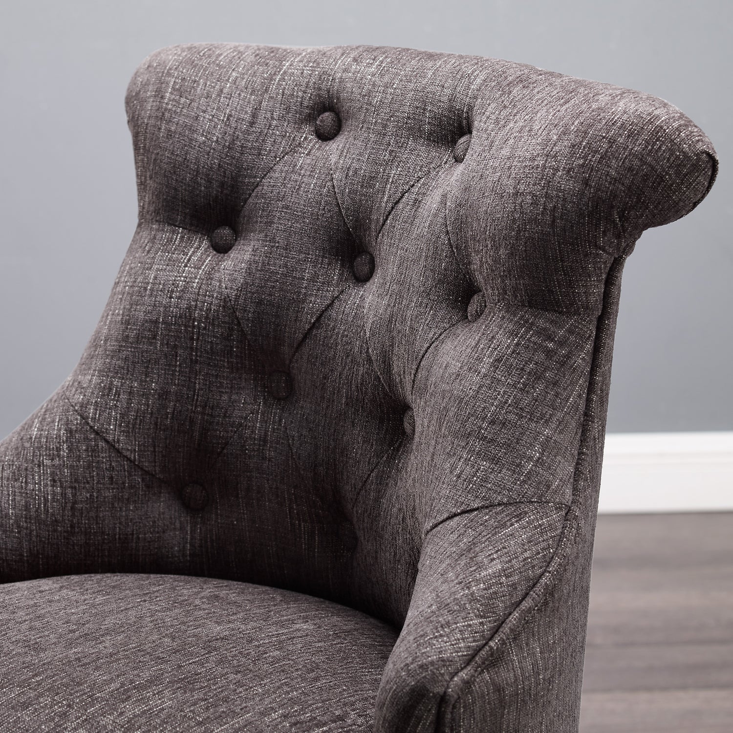 Add style and function to your office with this office chair. The soft, plush frame features a button tufted back and is upholstered in an aqua fabric. Silver or antique bronze nail heads accent the chair. A dark walnut wood or light grey base has metal casters for ease of mobility. Perfect for a home work space or the office.