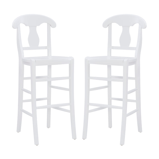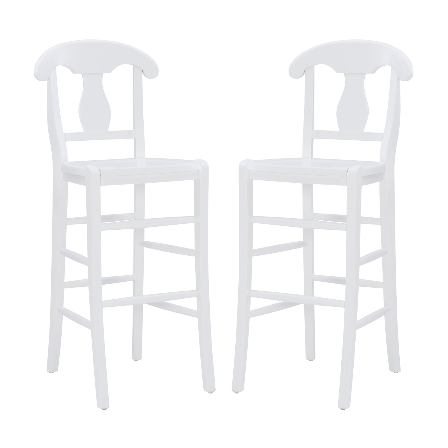 Embodying the charm and refinement of an old french cottage, this time honored counter stool makes for a defining piece in a variety of traditional settings. The sturdy beechwood frame is adorned with soft curves and an ornate splat back design to form an eye catching silhouette. The surface is painted white and coated in a glossy lacquer finish for long lasting shine and protection. The set of 2 arrives fully assembled, ready to elevate your farmhouse kitchen or home bar. Commercial grade