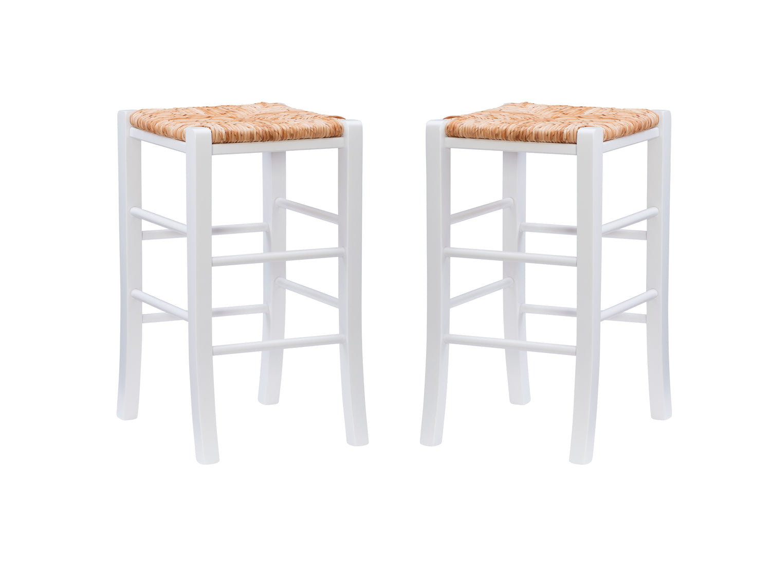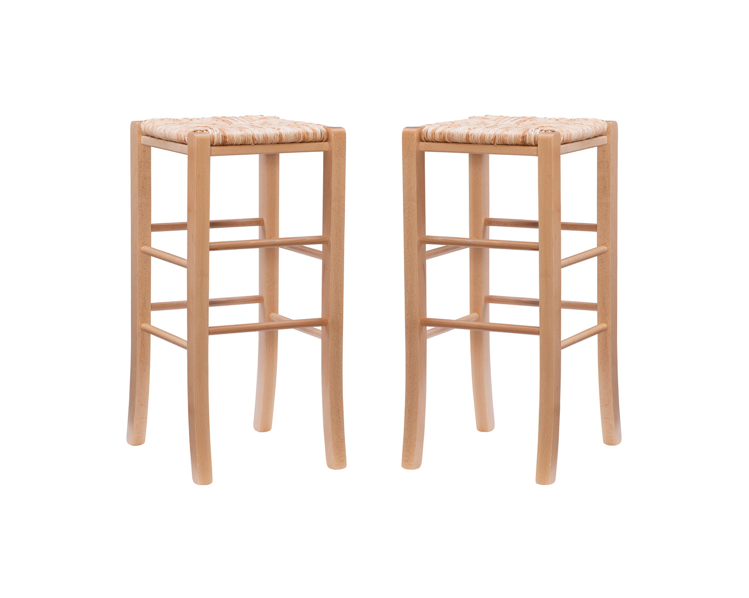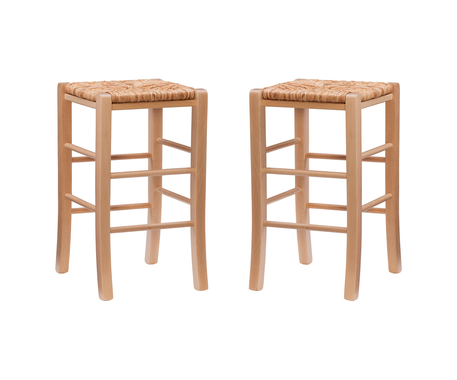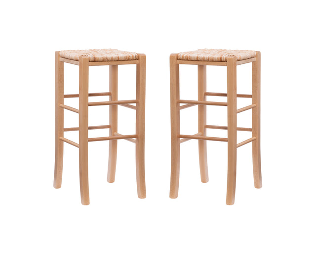 Modest and reliable, this classic set of 2 stools is the unsung hero of countless family gatherings. The natural toned frame is made of solid beechwood and is accompanied by handwoven rush seating as an ode to the countryside. Curved legs are supported by rungs that double as footrests for extra comfort and stability. With a backless design measuring just over 29" high for the bar stools and 24.5" for the counter stools, this European made stool can easily be tucked away under a bar or pulled out for extra seating. It arrives in a set of two.