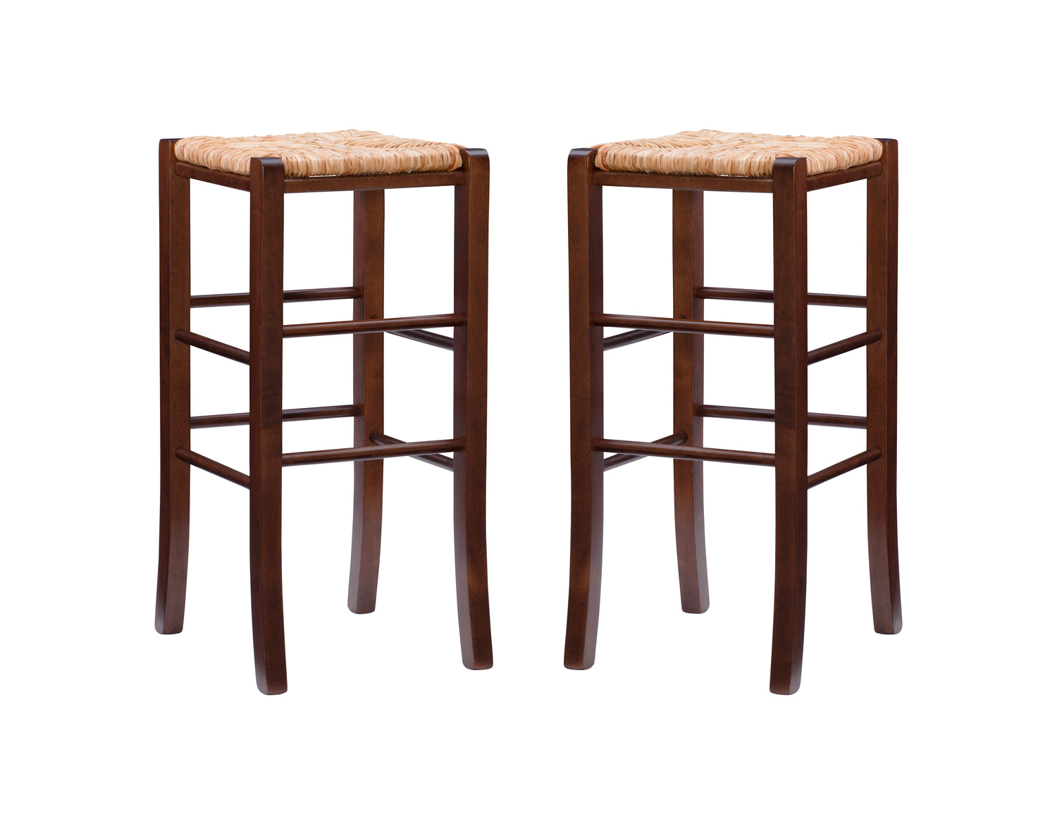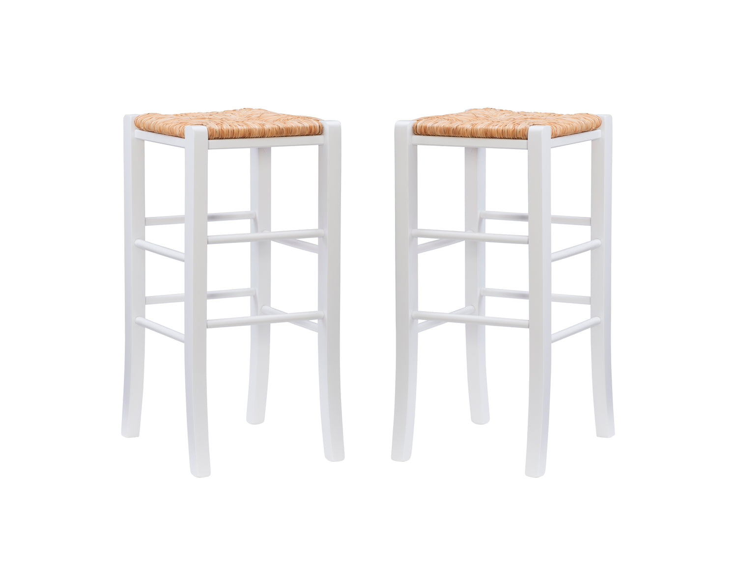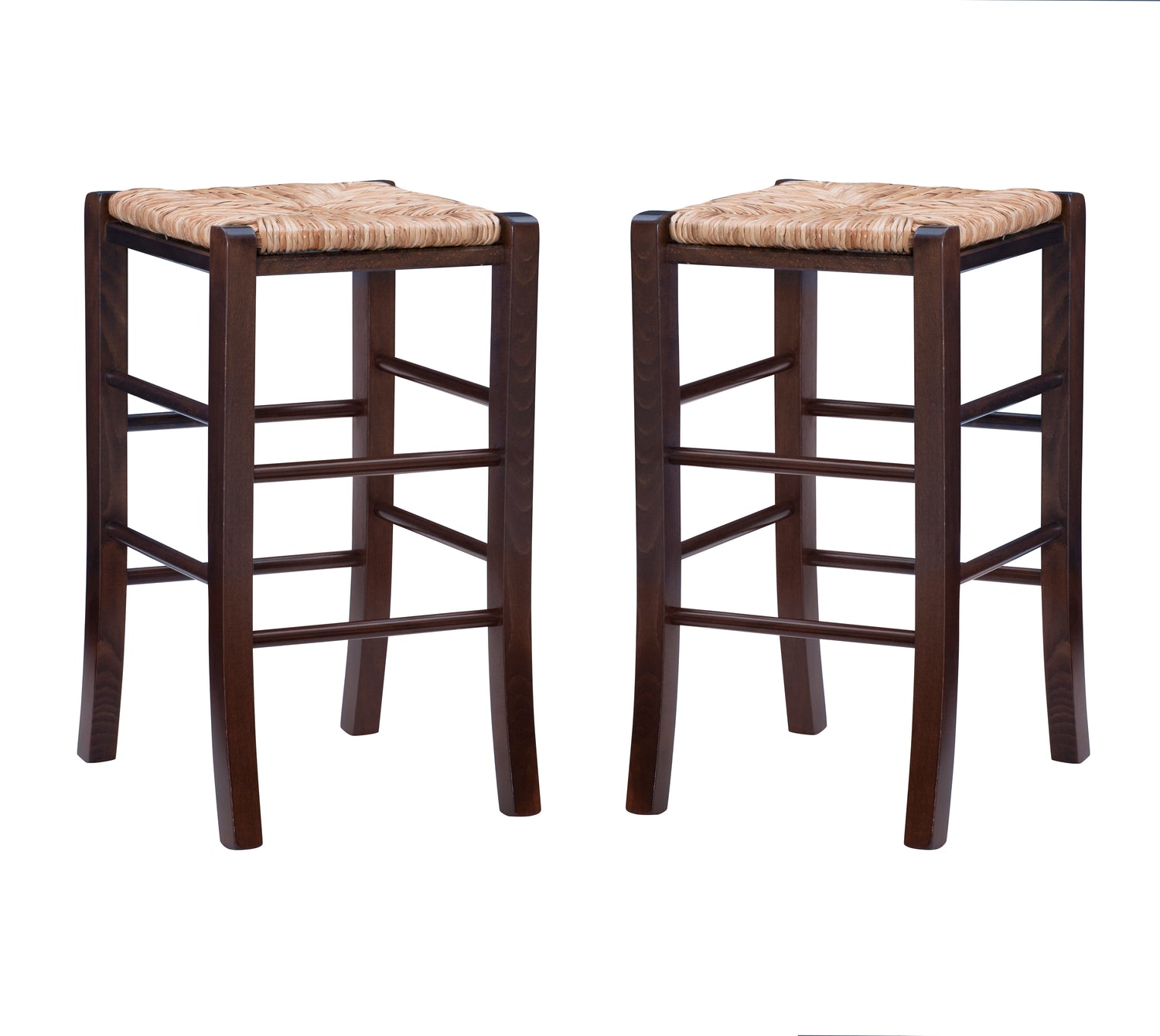 Modest and reliable, this classic set of 2 stools is the unsung hero of countless family gatherings. The natural toned frame is made of solid beechwood and is accompanied by handwoven rush seating as an ode to the countryside. Curved legs are supported by rungs that double as footrests for extra comfort and stability. With a backless design measuring just over 29" high for the bar stools and 24.5" for the counter stools, this European made stool can easily be tucked away under a bar or pulled out for extra seating. It arrives in a set of two.