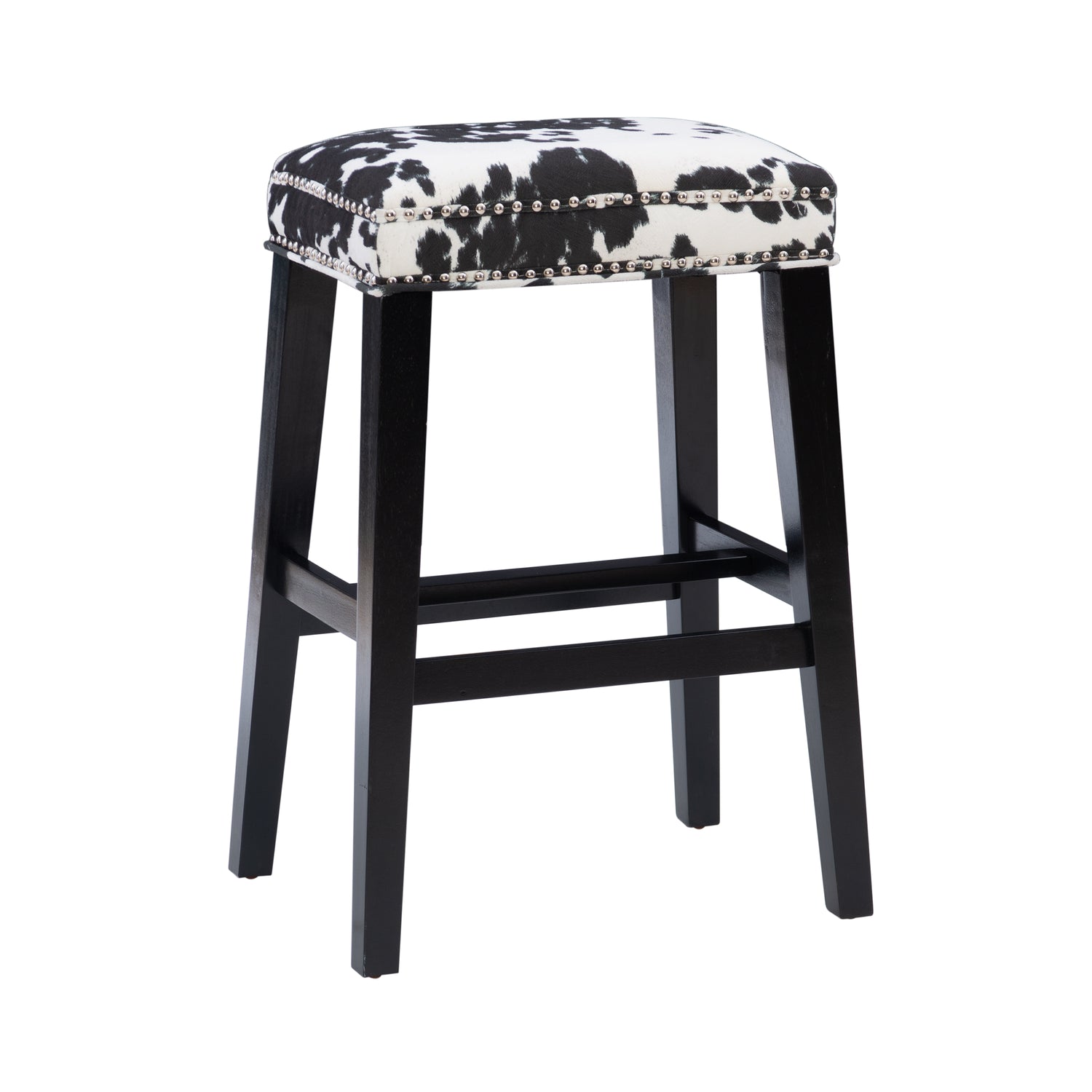 Traditional in style and design, this stool is a stylish addition to a kitchen or bar. The black or brown wood finish is accentuated with a matching cow print plush upholstered seat and embellished with a shiny silver nail head trim. Completing the stools structured design are four added footrails for stability. Bar and counter height.