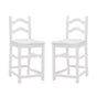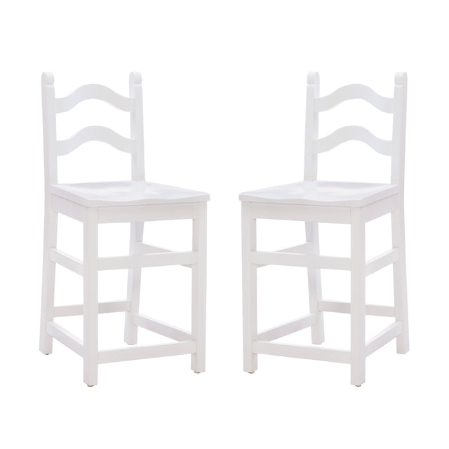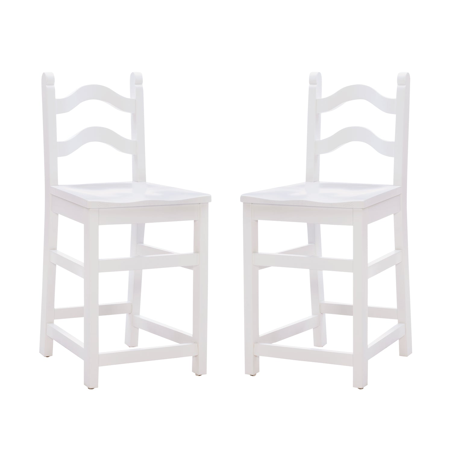 The waved ladderback of this counter stool offers ample support and makes for a perfect accent piece in various cottage dining spaces. The sturdy beechwood frame is finished in lustrous white paint and given a glossy lacquer finish for long term protection and shine. The whimsical silhouette lends itself beautifully to a modern farmhouse aesthetic and, with a seat height of 24", pairs perfectly with counters and kitchen islands 35" to 39" high. This american made set of 2 arrives fully assembled with the option to attach a brass kickback, also included in the carton. Commercial grade