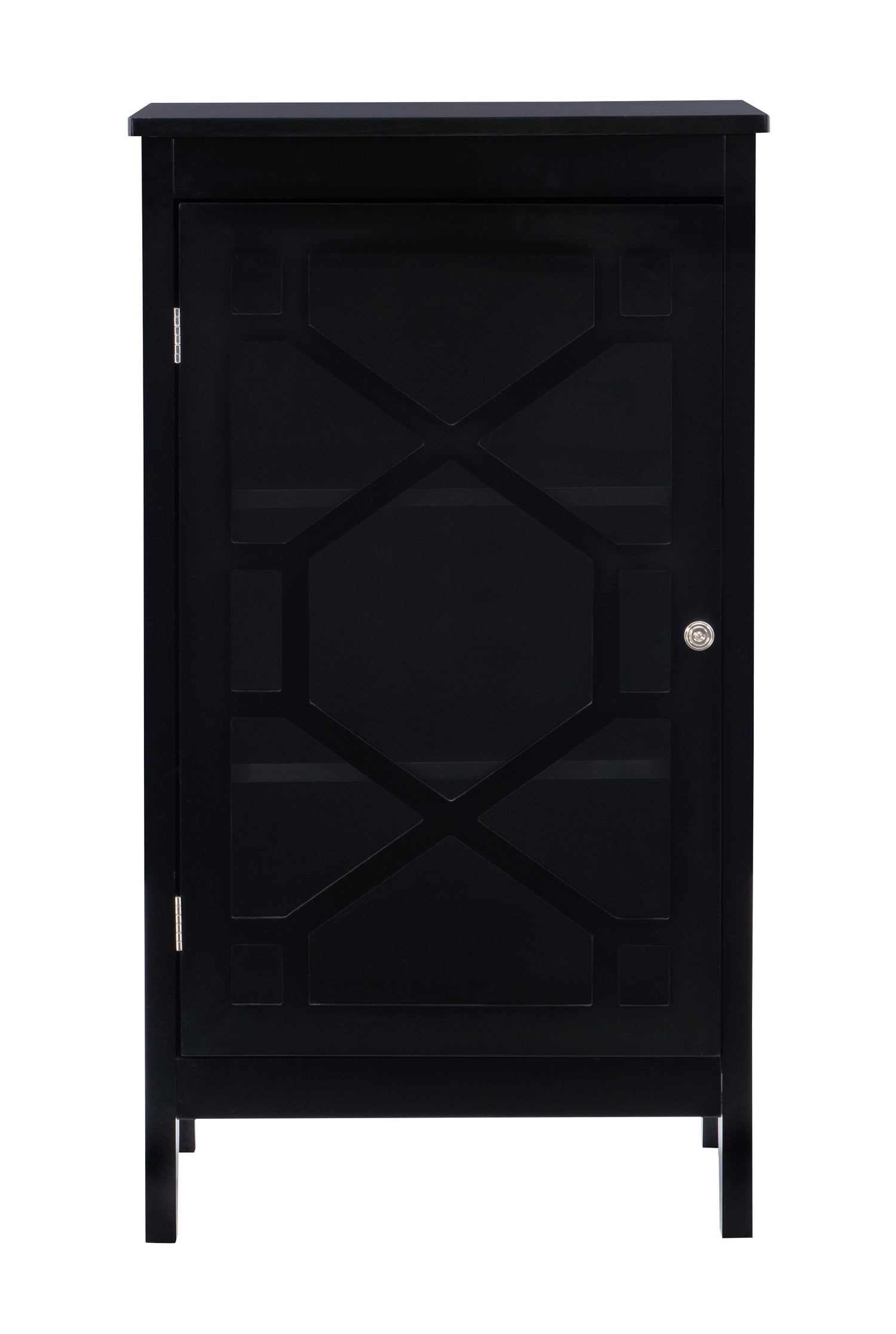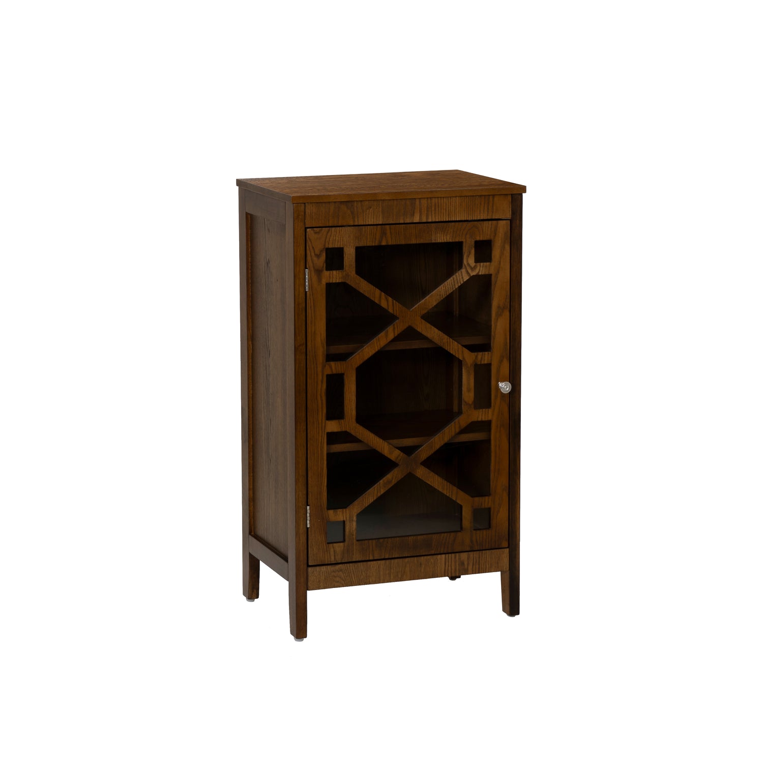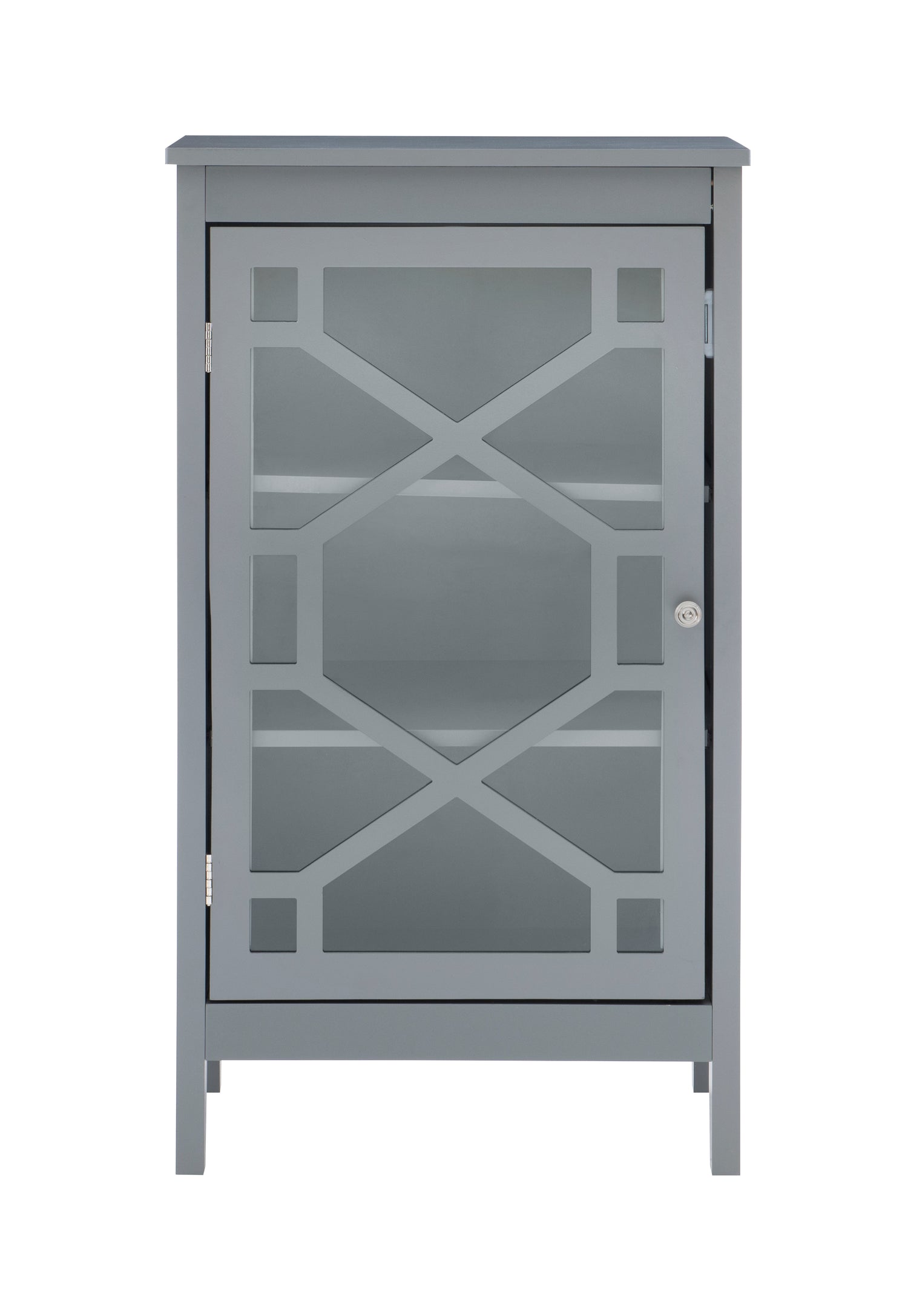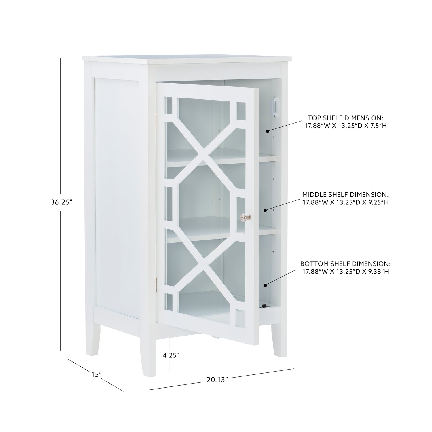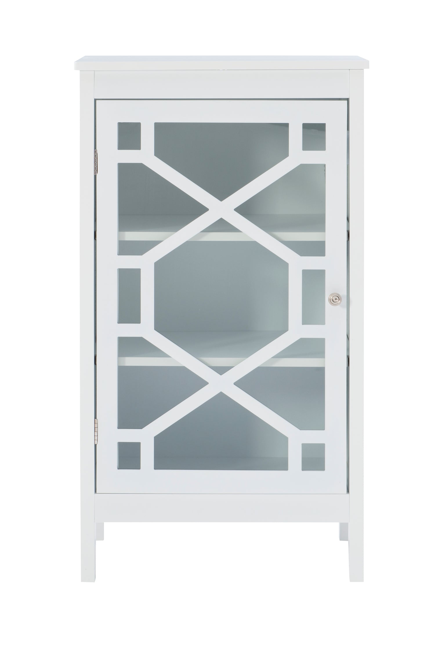 This small cabinet is a versatile accent piece, fit for any room in your home. The cabinet features a single designed glass door front that adds interest and appeal to the streamlined frame. Inside, three shelves provide ample storage space for all of your essentials. Finished in a neutral white, black, grey, and brown, the piece will easily complement any existing decor.