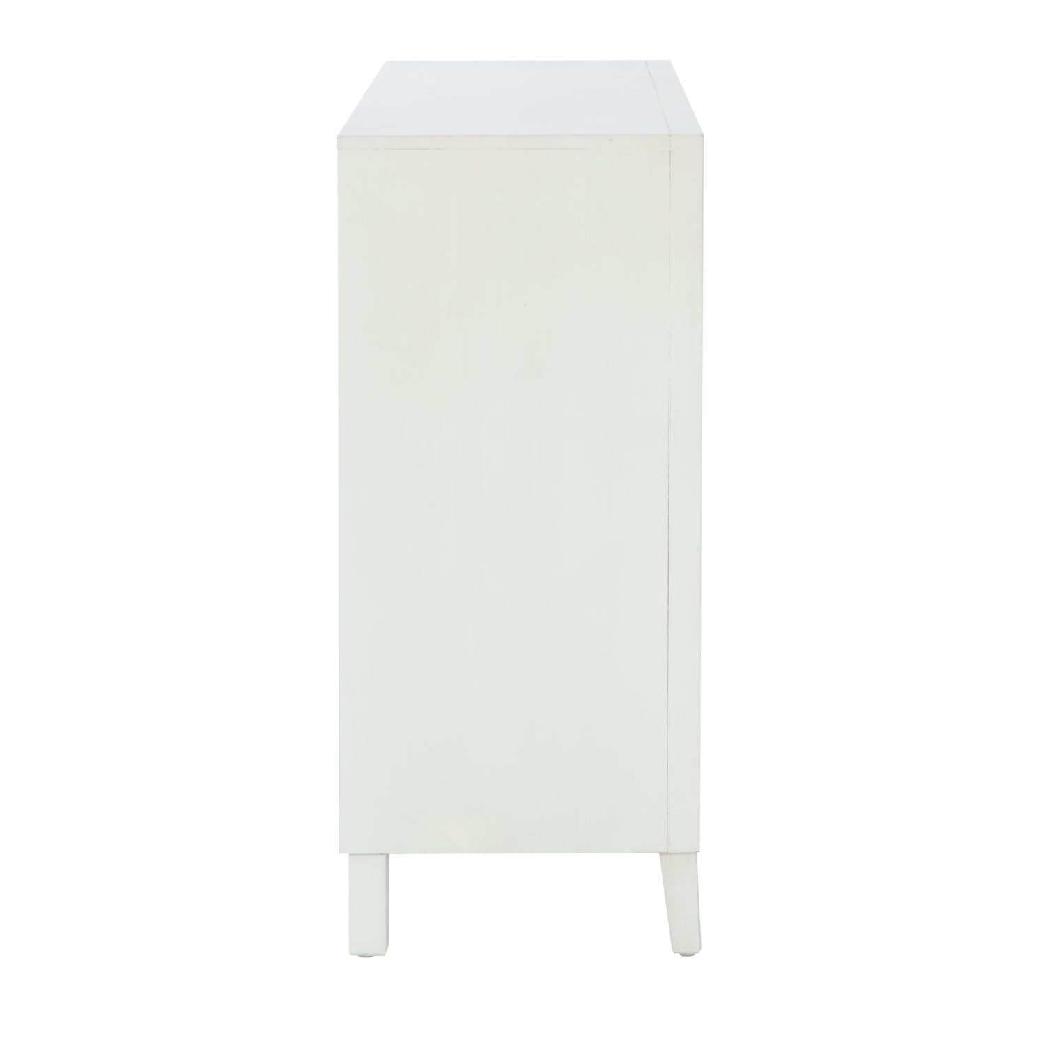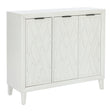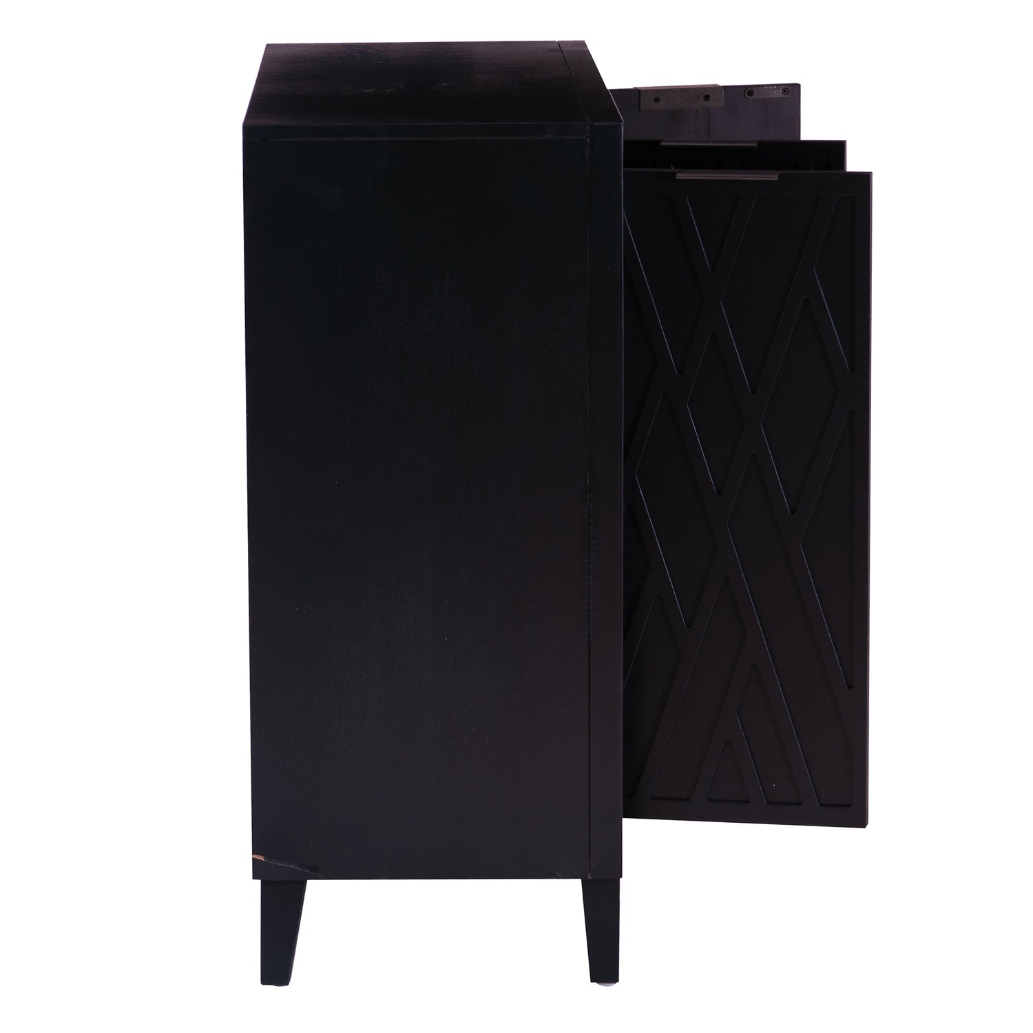 Elevate your home decor with this statement-making accent cabinet, where bold design meets everyday functionality. The three doors feature a repeating diamond pattern cutout, creating a dynamic sense of movement that adds visual intrigue to any space. Crafted with a sturdy, solid wood frame for lasting durability, this cabinet is as practical as it is stylish. Metal door handles provide effortless access to the spacious open interior, complete with a single shelf perfect for organizing anything from media accessories to bathroom linens. A true fusion of form and function, this cabinet is a stunning focal point for any room.