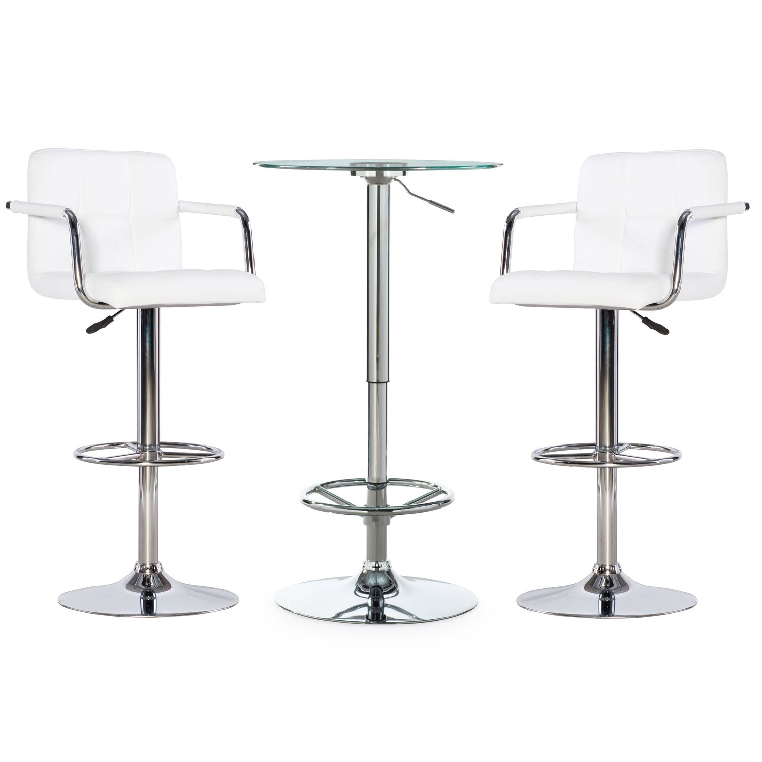 Designed for the modern tastemaker, this 3-piece Faux Leatherb set delivers a refined fusion of comfort and polish to transform everyday dining into an upscale experience. The clear tempered glass table floats above a chrome pedestal base, outfitted with a smooth height-adjustment lever that adapts to every moment. At the flanks are two grid-tufted bar stools upholstered in supple black or white faux leather that feature cushioned armrests, curved backs, and 360-degree swivels for a full range of motion. The chrome-finished frames and footrests add a chic architectural polish, grounding the set in a graceful simplicity. Ideal for cocktail hours, casual mornings, or elevated small-space dining, this set is sleek, smart, and ready to impress.