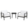 Create a cozy and sophisticated outdoor retreat with this elegant 3-piece set. Featuring 2 modern armchairs with generously padded cushions and a matching side table, this trio presents clean design with unmatched comfort. Rust-resistant aluminum frames in a black powder-coated finish ensure long-lasting performance, while the plush cushions in natural canvas Sunbrella™ fabric resist fading, stains, and mold season after season. In the supporting role, the slatted side table offers a compact and convenient surface for drinks, snacks, and decor. Whether set on a patio, balcony, or rooftop deck, this set is sure to bring new functionality and style to your space.