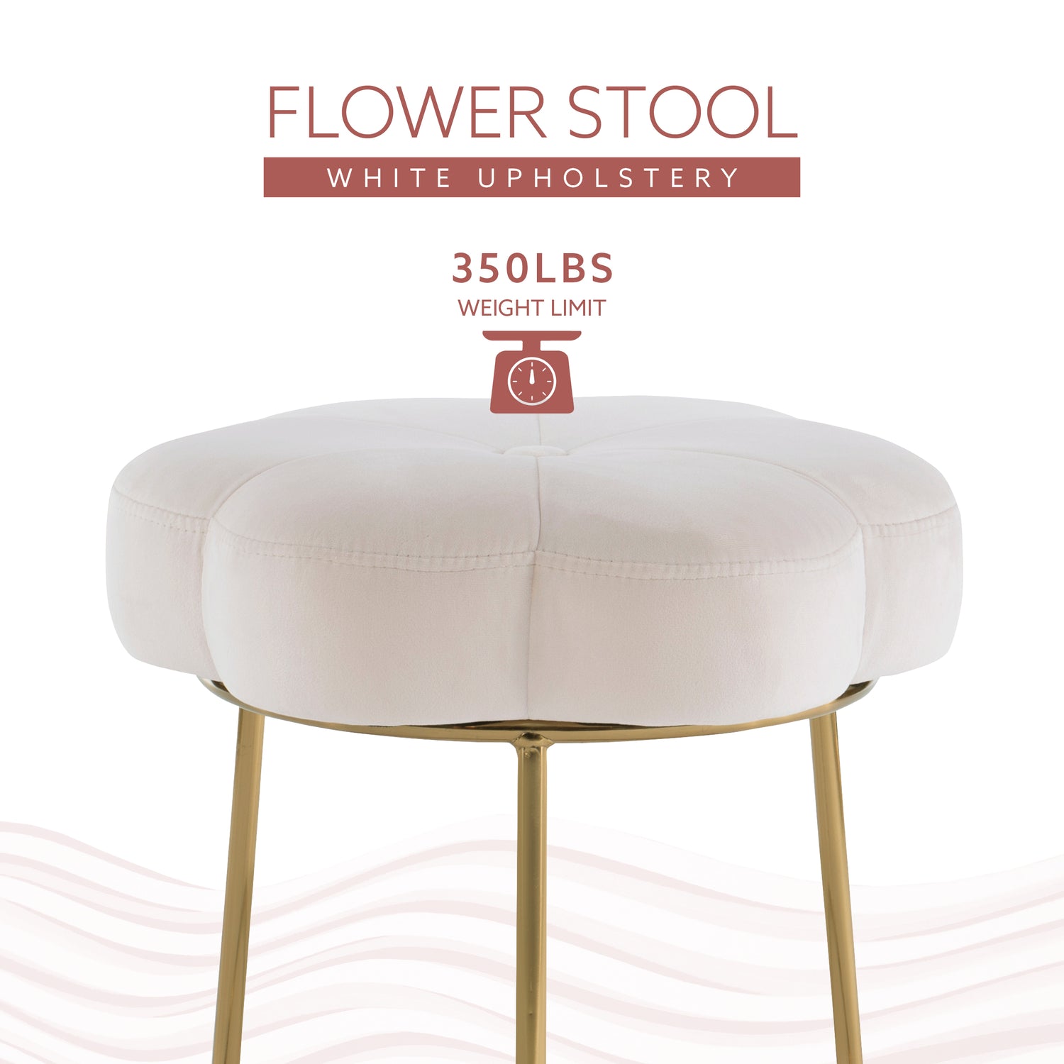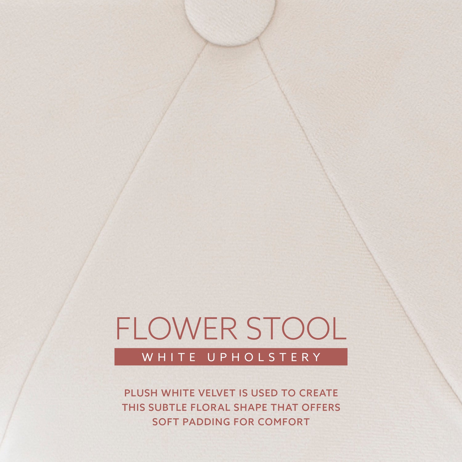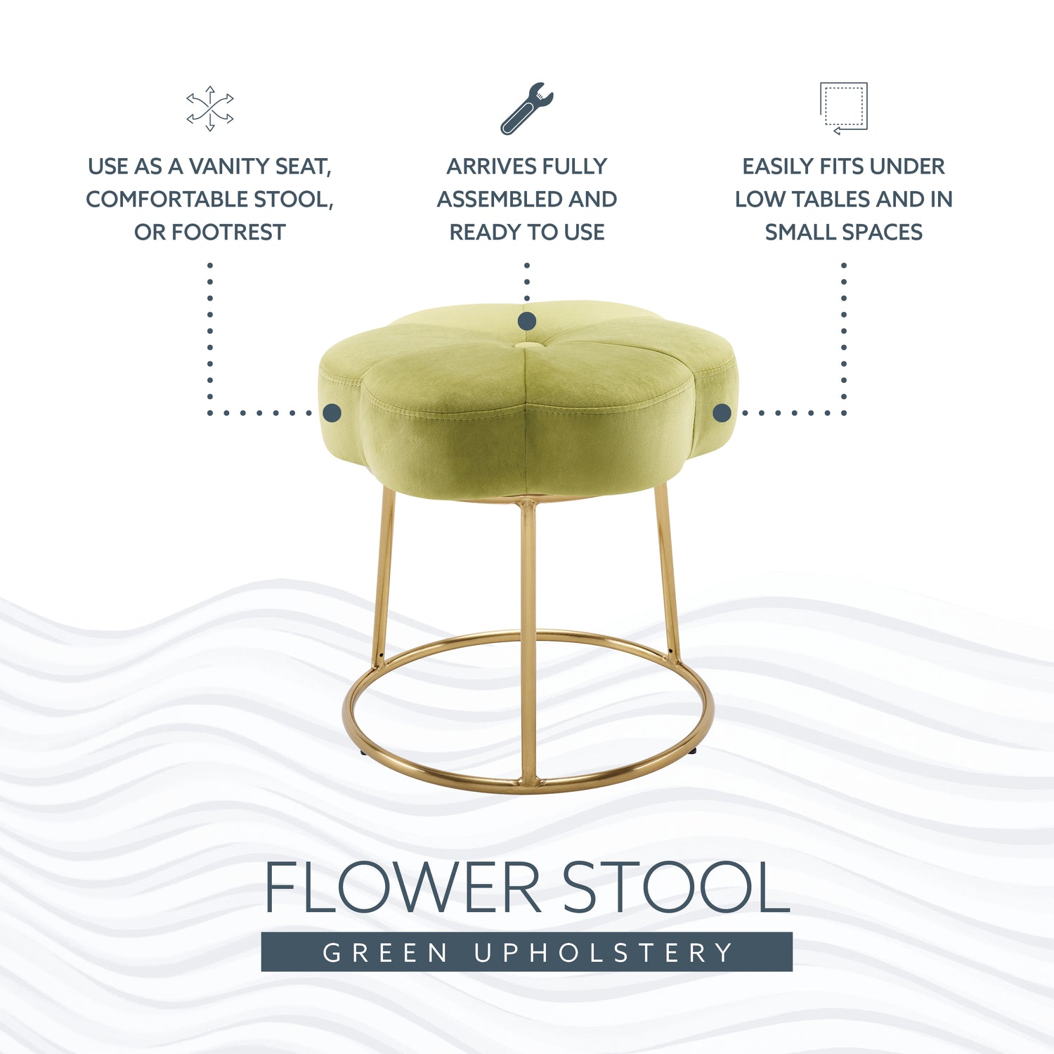 Inspired by boho design, a perfect pairing of minimal lines while still conveying a luxurious style. Plush velvet is used to create this subtle floral shape that offers soft padding for comfort. The foundation is an elegant gold color plated base. Sitting 17.75 Inches off the floor, this happy stool can fit under a make up vanity, bathroom prep table, desk or really, anywhere. Adds a welcomed pop of color to any room. Multiple colors to mix and match.