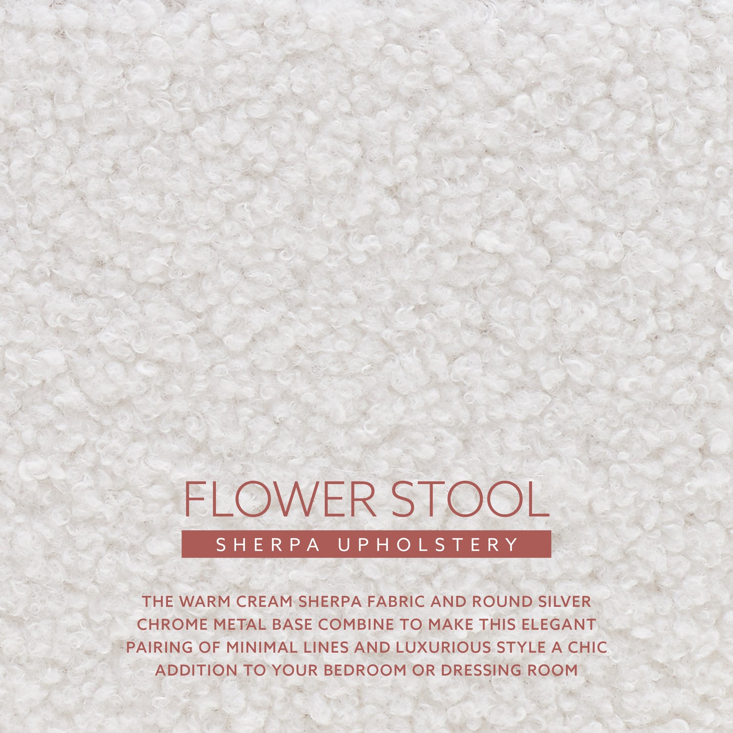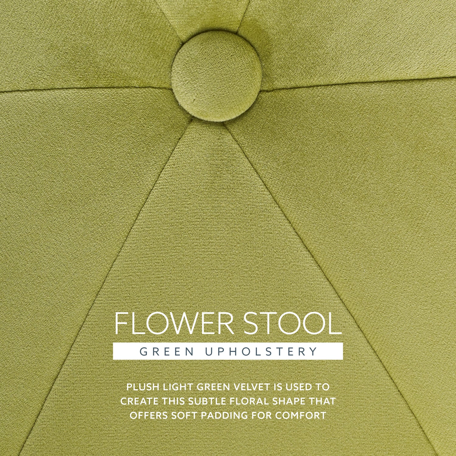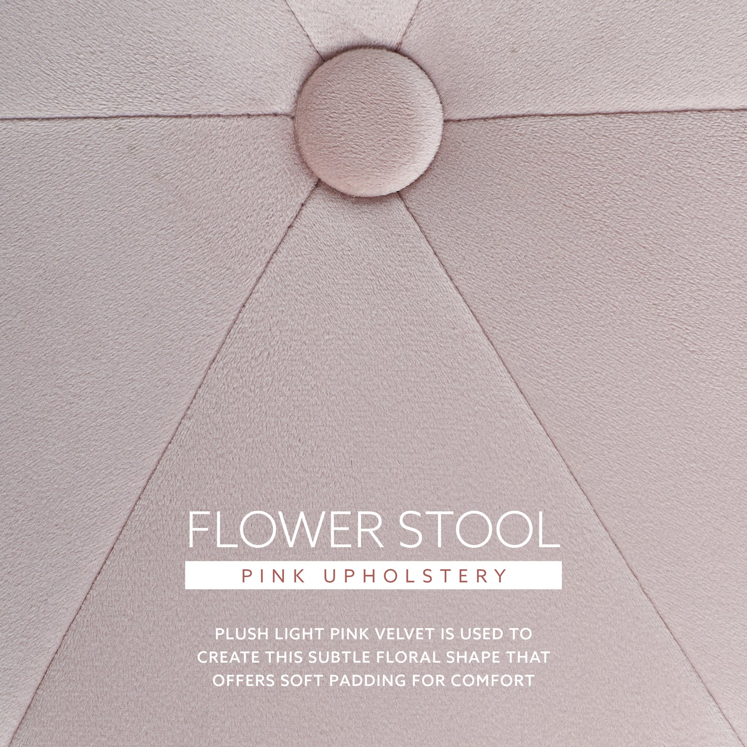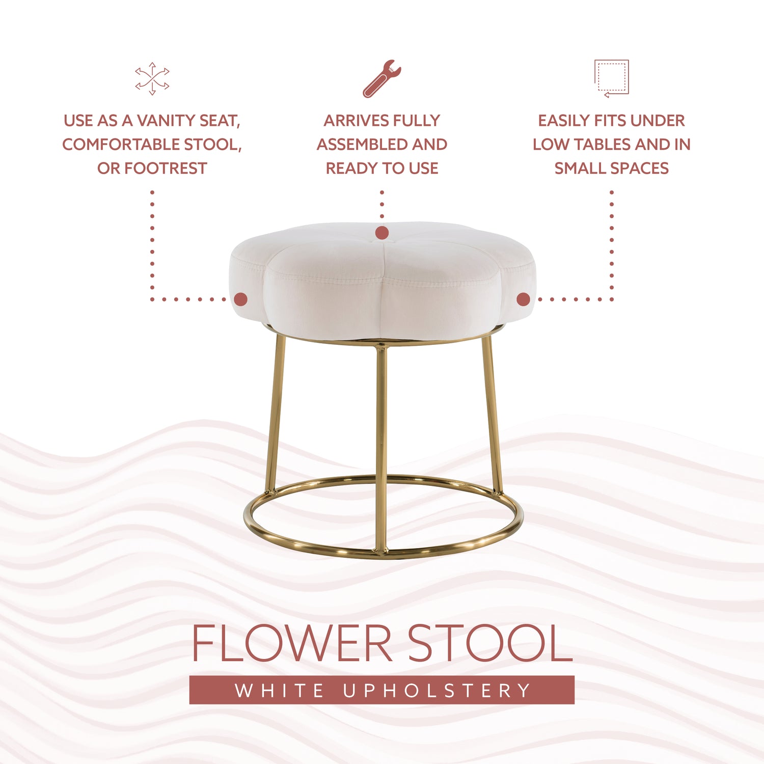 Inspired by boho design, a perfect pairing of minimal lines while still conveying a luxurious style. Plush velvet is used to create this subtle floral shape that offers soft padding for comfort. The foundation is an elegant gold color plated base. Sitting 17.75 Inches off the floor, this happy stool can fit under a make up vanity, bathroom prep table, desk or really, anywhere. Adds a welcomed pop of color to any room. Multiple colors to mix and match.