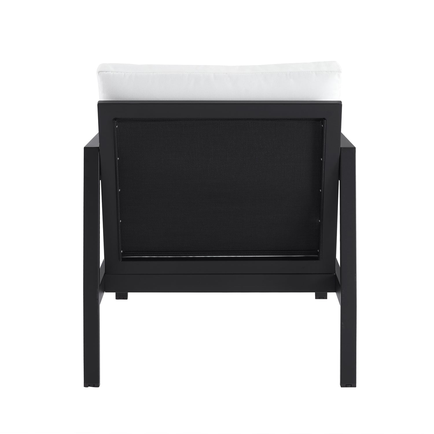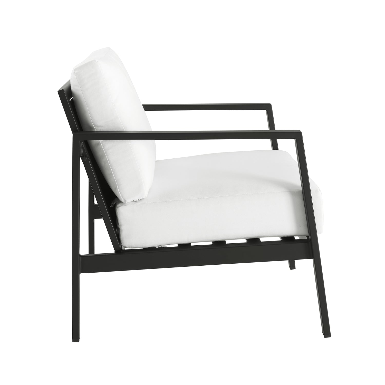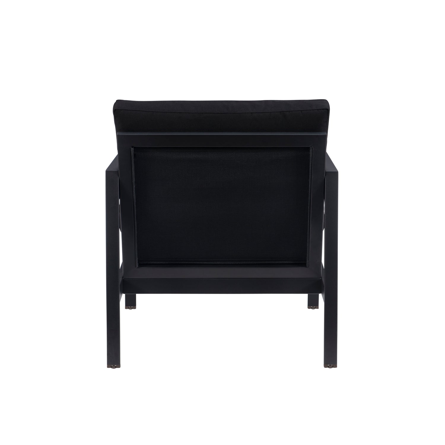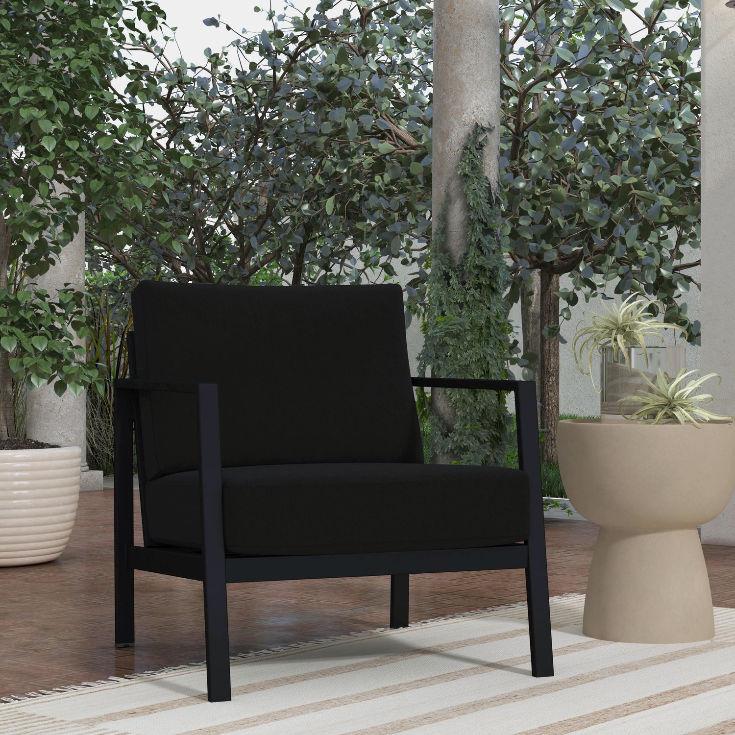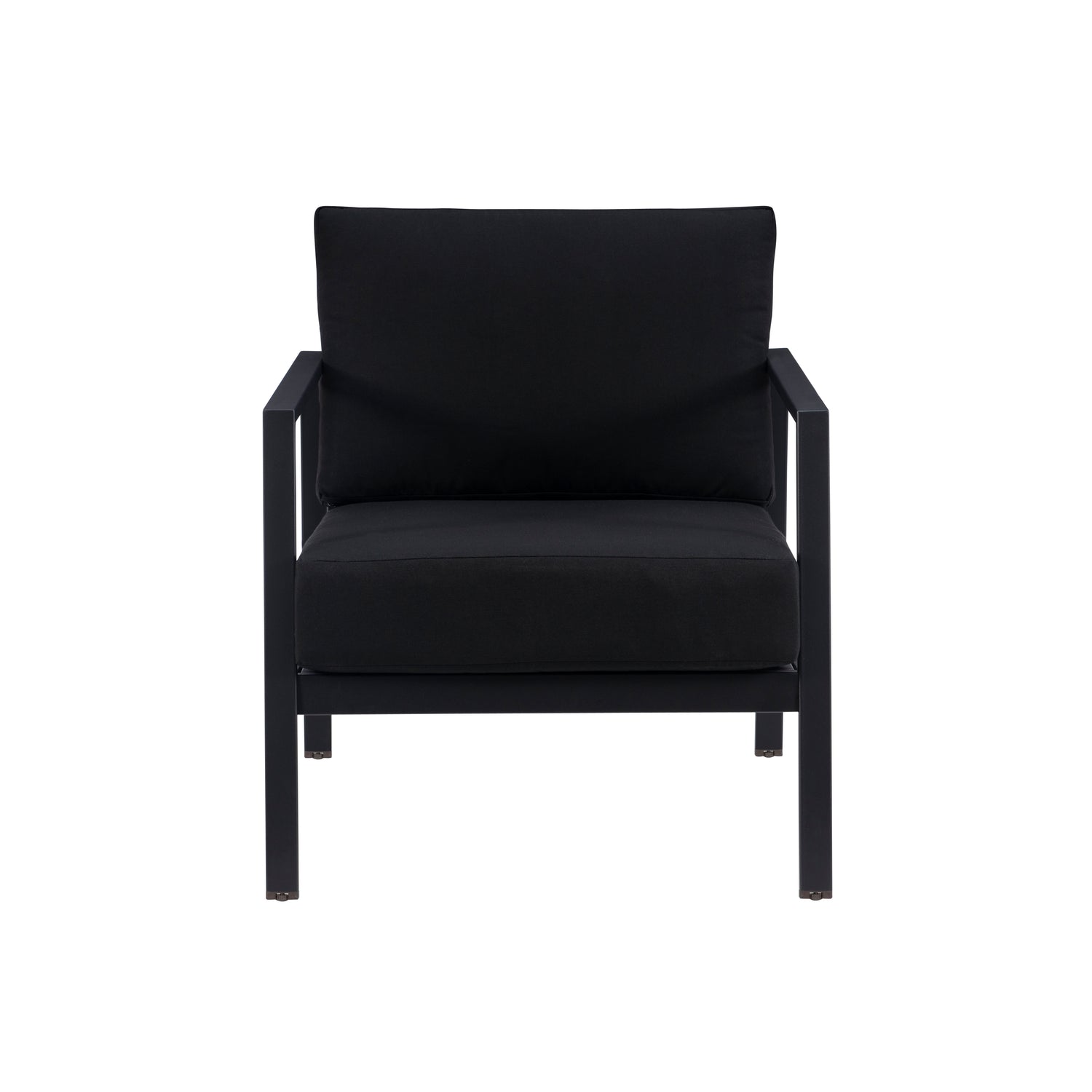 Sleek, comfortable, and designed for the outdoors, this modern armchair is the perfect upgrade for your patio, porch, or rooftop. The black powder-coated aluminum frame offers both durability and lightweight portability, making it easy to move while maintaining strength. Plush cushions wrapped in premium Sunbrella fabric resist fading, stains, and mold, ensuring they remain vibrant and fresh season after season. Compact in size but generous in comfort, this chair combines timeless style with low-maintenance design for a versatile outdoor essential.