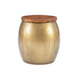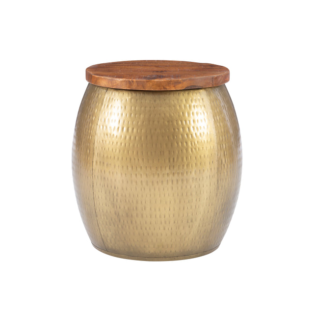 Add a touch of elegance to your home with this hammered metal storage drum. Handcrafted in India, the muted brass or pewter finish of the metal body and rich texture of the solid wood lid create a rustic, eye catching contrast. The lid lifts off to reveal hidden storage, perfect for extra blankets, pillows or rogue remote controls. Measuring 19" from the ground, this versatile accent piece doubles as a small table and subtle storage that fits wonderfully next to a couch or set of chairs.