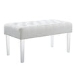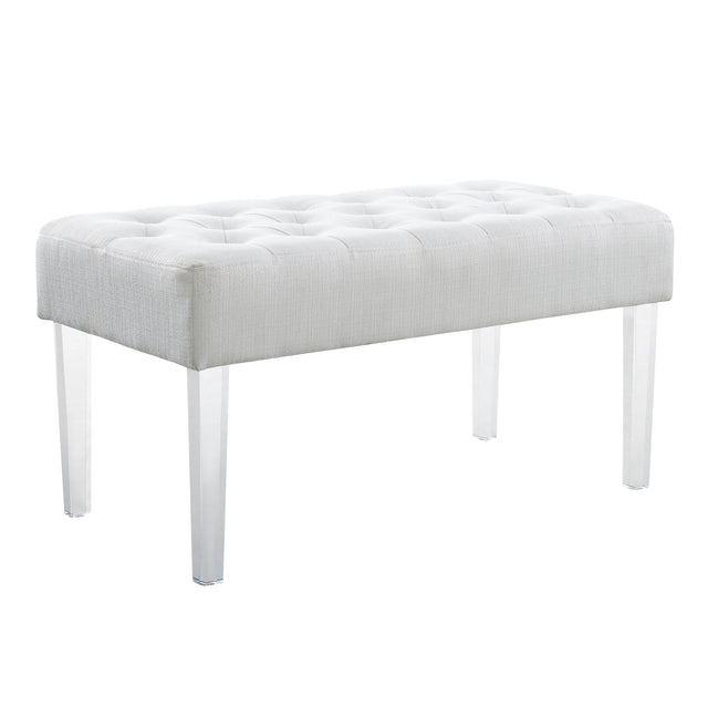Exuding modern design and appeal, this acrylic leg bench is perfect for adding eye-catching style to any space. The clear acrylic legs offer a dramatic look to the simple shape. The plush seat is upholstered in a white linen weave fabric with silver lurex threads and features simple tufted details. Perfect for placing in a bedroom, dressing area or living space. 18" Seat height