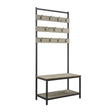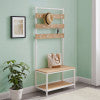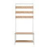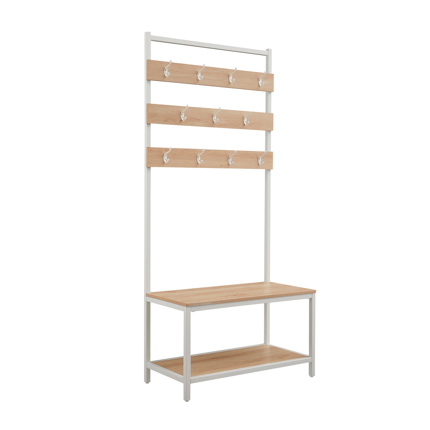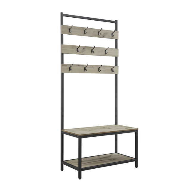 Hall trees have never looked so chic while being so functional. Scarves, coats, hats and bags will all find a welcome home on the multiple hooks available. The lower shelf is ideal for bins of toys and shoes, and the sturdy bench is the perfect place to decompress after a long day. The classic gray washed wood veneer and durable gray metal frame or luminous natural wood veneer and durable white metal frame will surely complement your design aesthetic while providing a practical finishing touch to your home.