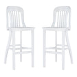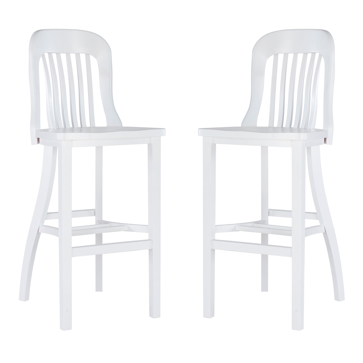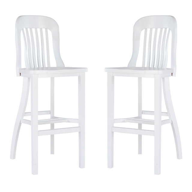 Subtle twists and turns in the silhouette of this barstool make for an intriguing mix of modern and traditional aesthetics that is sure to pique the interest of family and guests alike. Constructed of solid beechwood for ensured strength and stability, the frame is then painted in a lustrous white, sealed, sanded and coated in a lacquer finish for extra protection and a glossy shine. Adding to the contrast is a wide saddle seat countered by a narrow slat back design and inward curving support rungs that connect the legs. The set of two arrives fully assembled and supports up to 300 lbs each stool. Commercial grade