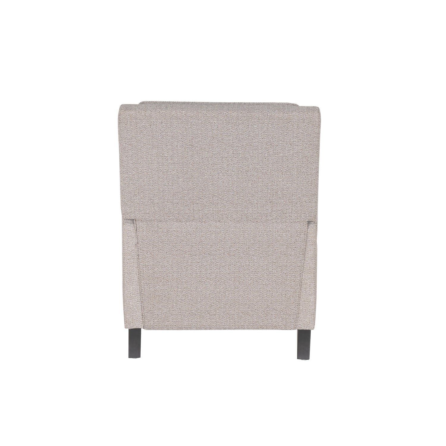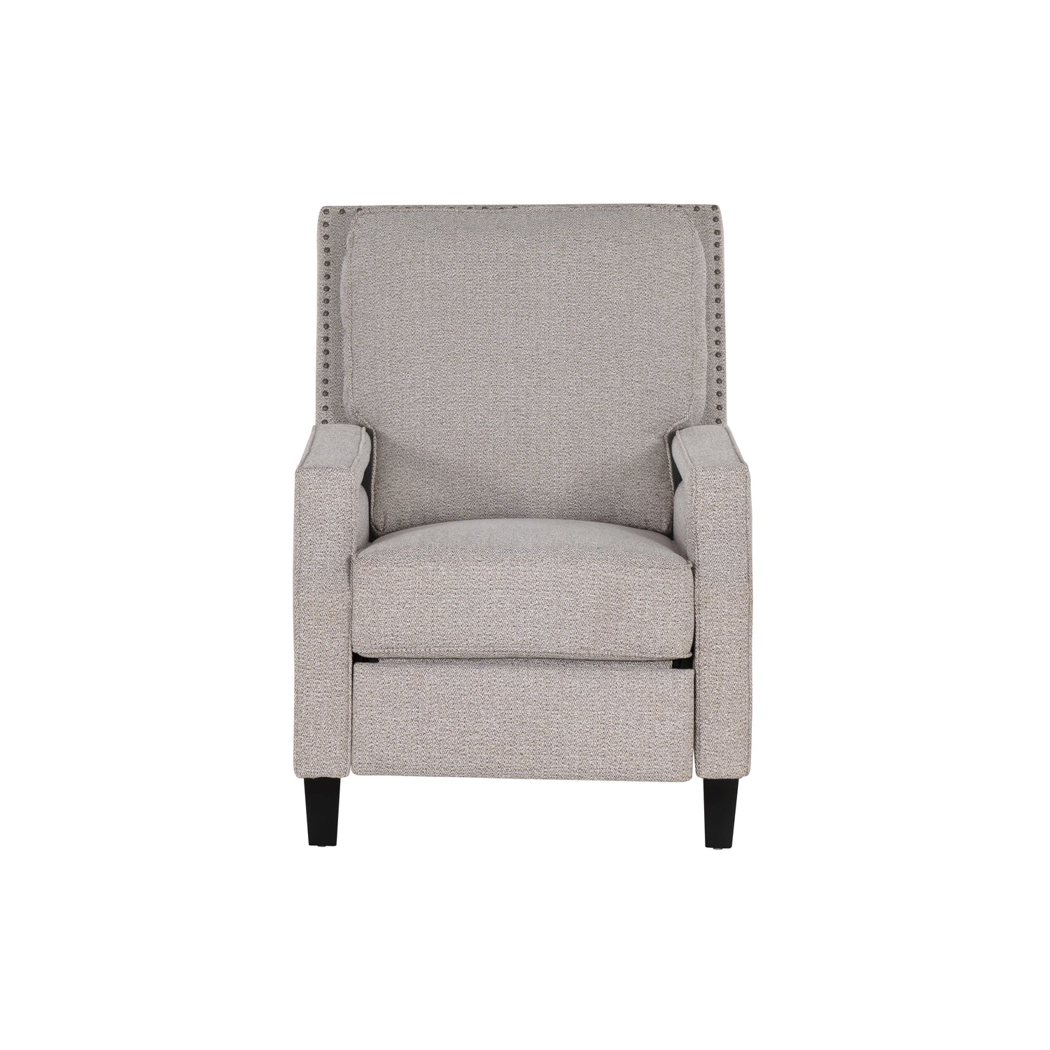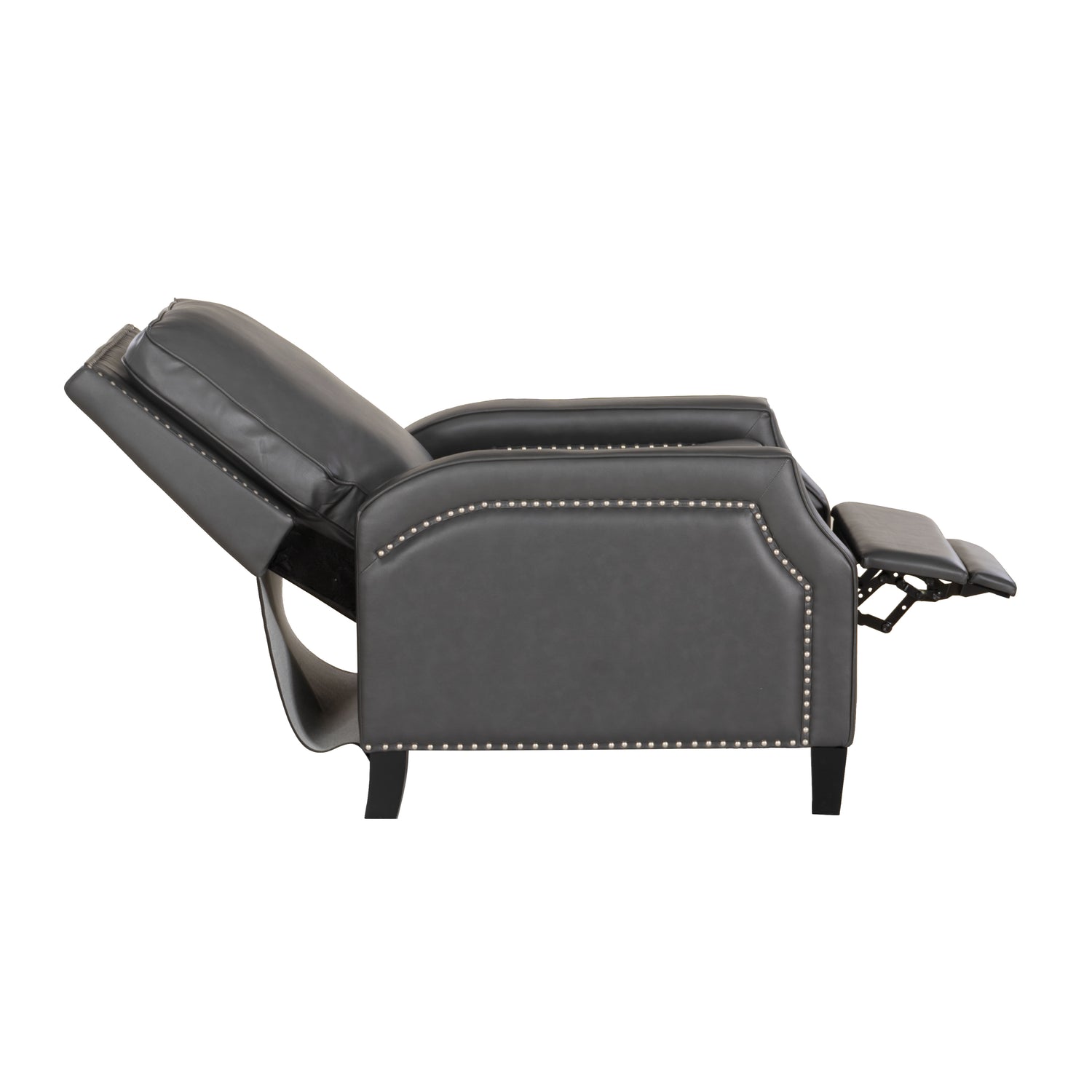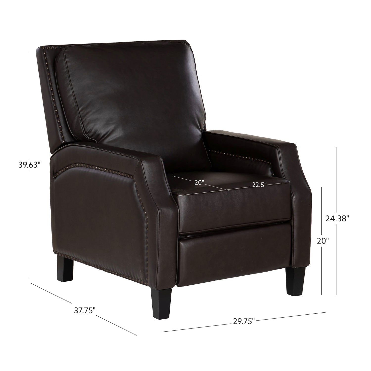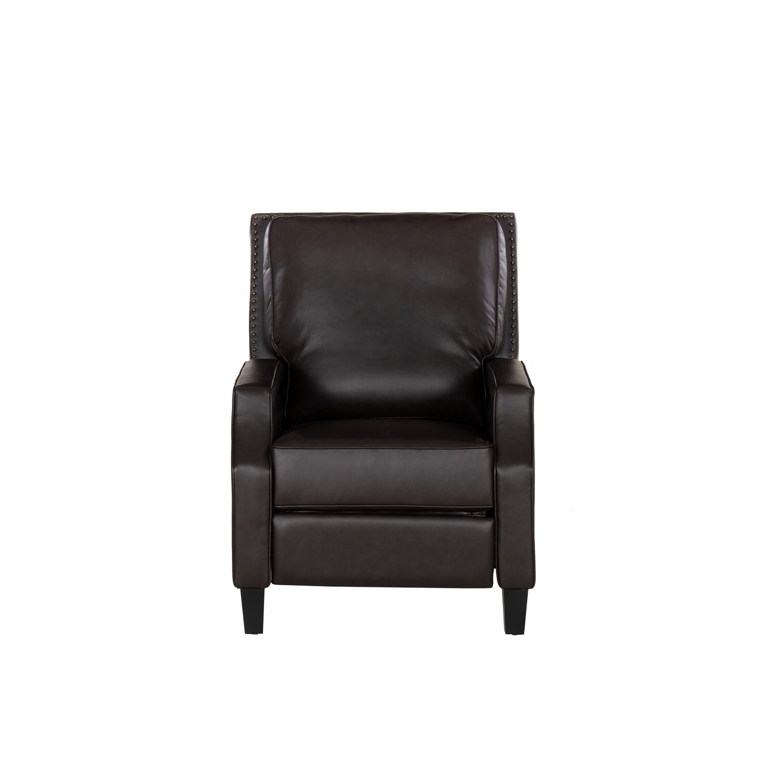 Inspired by the timeless allure of vintage cocktail lounges, this Faux Leathershback recliner presents an outfitted update to a classic design. High-density foam cushioning ensures comfortable support, while a discreet reclining mechanism allows for effortless transitions from an upright position to full-body repose—no levers or buttons necessary. Supple faux leather in chocolate or gray, or fabric in coconut or ice blue is upholstered over the sculpted frame and cushions for a sophisticated look that’s smooth to the touch and a breeze to maintain. Rows of antique brass nailhead trim trace the edges for a polished boho accent, while black tapered wooden legs provide a sturdy base. Whether you're kicking back after a long day or catching up on your favorite book, this chair makes every moment feel effortlessly luxurious.
