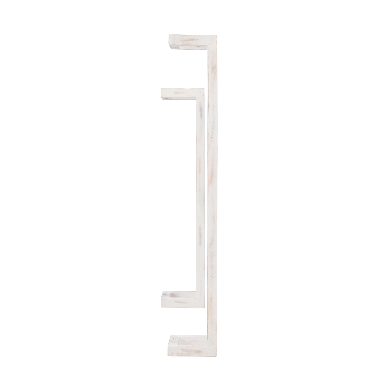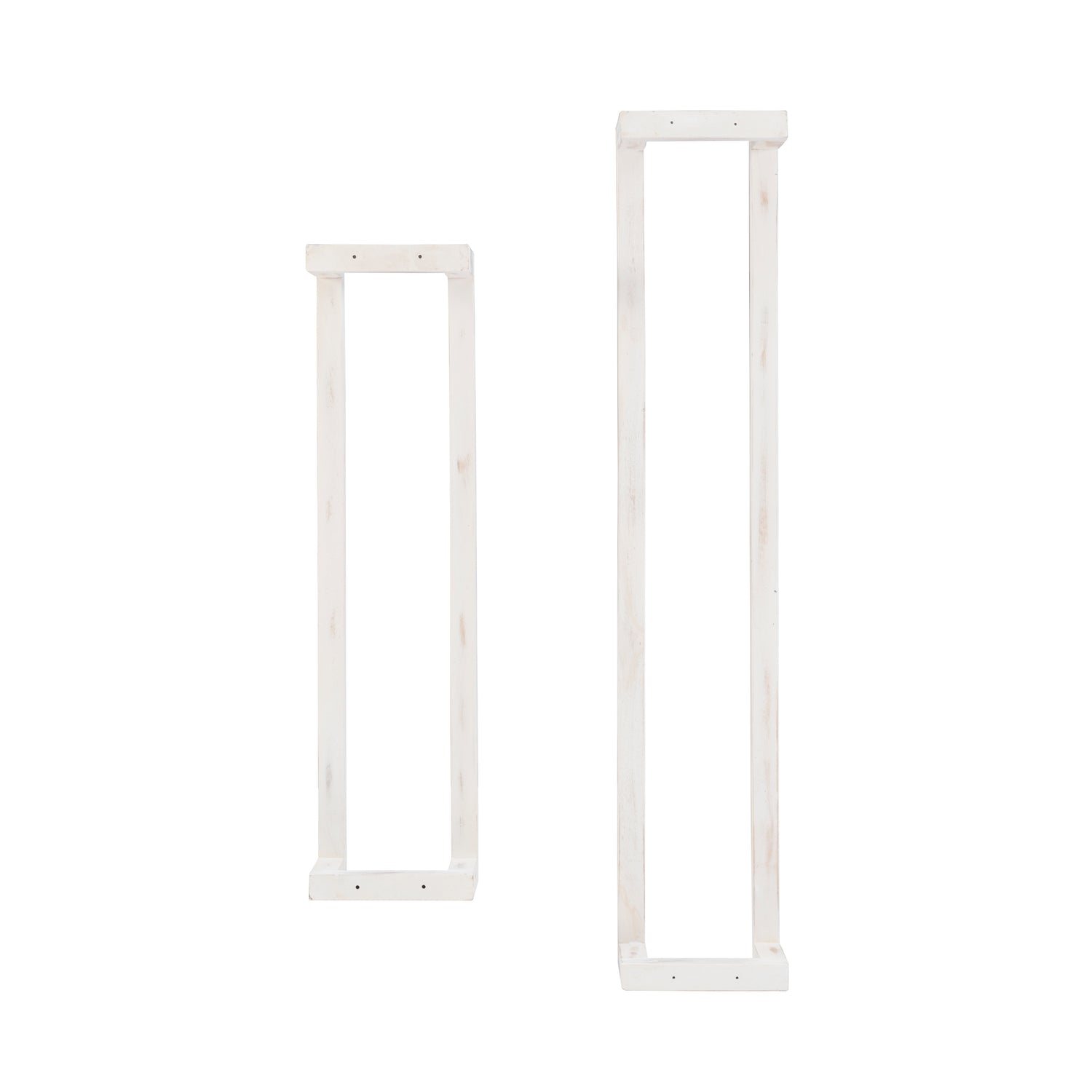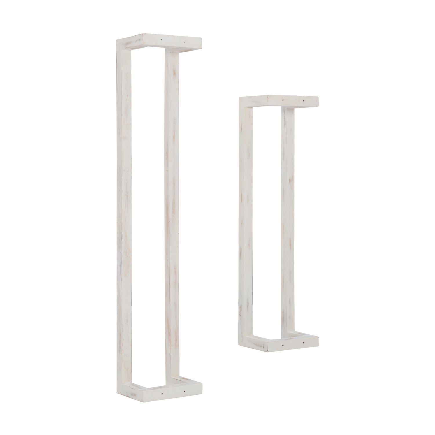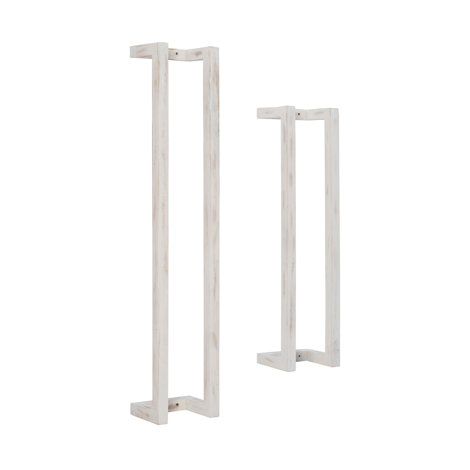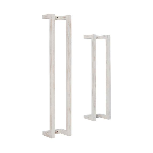 Fresh towels are just an arms reach away with this rustic set of towel racks. The solid mango wood frames are painted in a whitewash, sealed and covered in a lacquer finish for extra protection against moisture and long term use. The open design fits seamlessly in a bathroom, kitchen or laundry room, providing an organized display for rolled towels, small handcloths or throw blankets. Ready to make a big difference in small spaces, the larger piece of the set measures at 48" long and the smaller at 36". Also great for keeping you yoga mats and towels neat and easy to access.